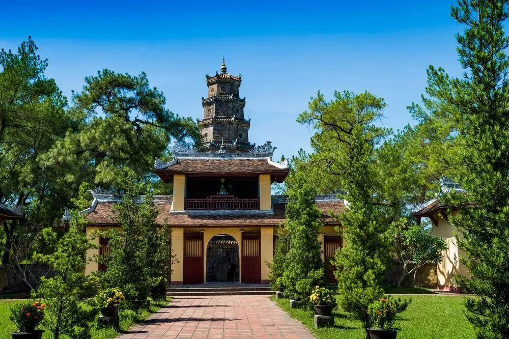 探访顺化近420年历史的古老佛寺,标志性的七层福缘塔临江而立,登上去能俯瞰整条香江与古城全景。寺内保留着古钟与石碑,见证了越南的近代史。