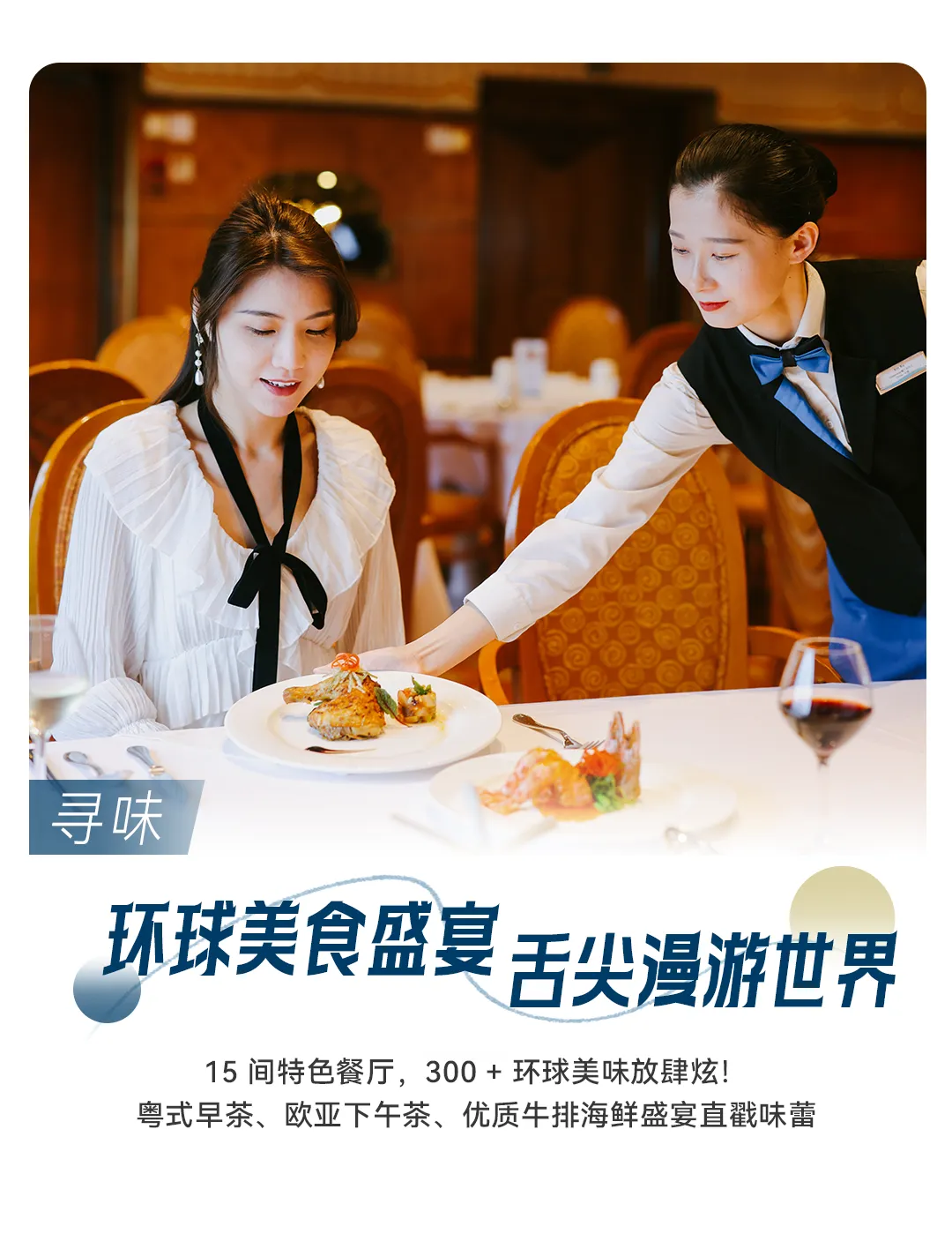 不用担心出国吃不惯!船上藏着15间特色餐厅,300多款环球料理。现蒸现点的粤式早茶,英式下午茶的甜点和红茶;还有鲜嫩牛排、生猛海鲜全都有。